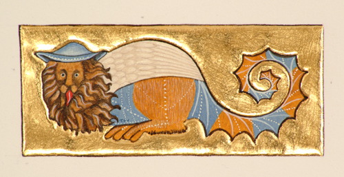 - Lion Dragon with a broad-brimmed hat! 24 carat gold on manuscript gesso, egg tempera.