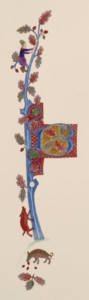 - Illuminated B with pigs, acorns and an oak tree. 24 carat gold leaf and egg tempera.