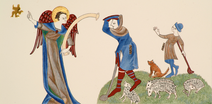 - Luttrell Psalter. Annunciation to the Shepherds. 24 carat gold leaf and egg tempera.